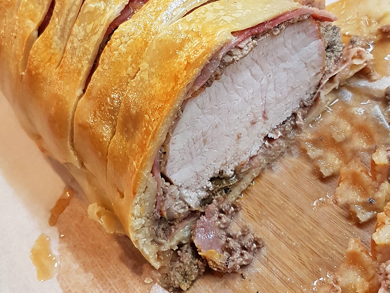 Слага се свежо фолио на масата. Нареждат се резените бекон, като е добре леко да се застъпват. Отгоре се разстила гъбената паста и се слага филето. След това с помощта на фолиото се прави руло, като е важно бекона и гъбите да не се разместят и плътно да увият филето. Увийте много плътно с фолио и оставете в хладилника за 30 минути